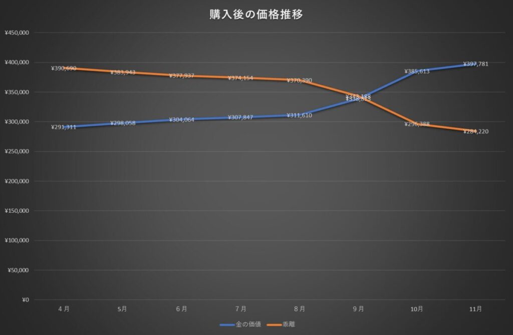 11月の平均金相場は20,399円に対し保有しているネックレスは18Kの26gなので資産価値は397,781円。