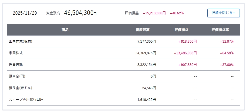 現金は証券口座及び証券口座に連動した口座の金額のみで、その他の現金はプライバシーの関係上含めていません。