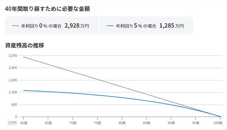 60歳から毎月6.1万円の取り崩しを100歳まで行える資産額を算出します。