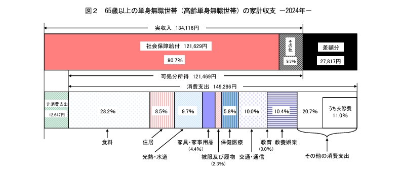 総務省の2024年家計調査によると高齢単身無職世帯の平均支出額は149,286円となっています。