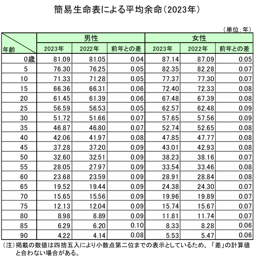 2023年の簡易生命表による平均寿命は男性で81歳、女性で87歳となっています。