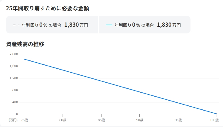 まず75歳から100歳まで貯蓄を毎月6.1万円取り崩すのに必要な金額を求めます。
