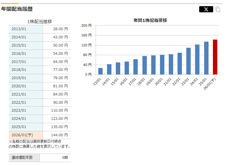 企業が毎年増配してくれるので何もせず勝手に配当額が増えていきます。
