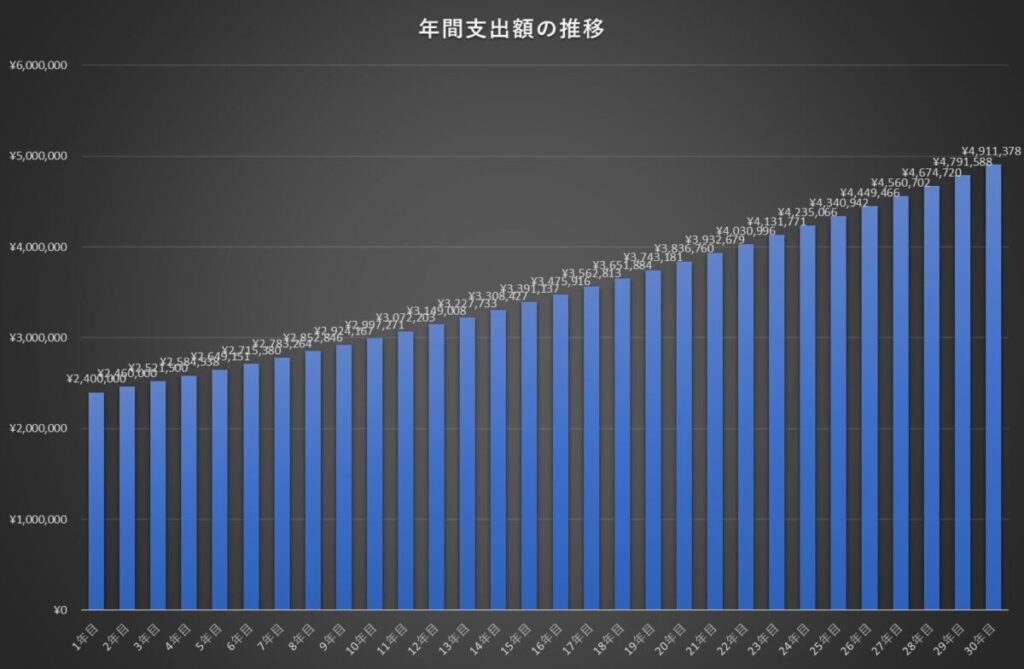 間をとってインフレ率を2.5%とし年間支出240万円の場合
