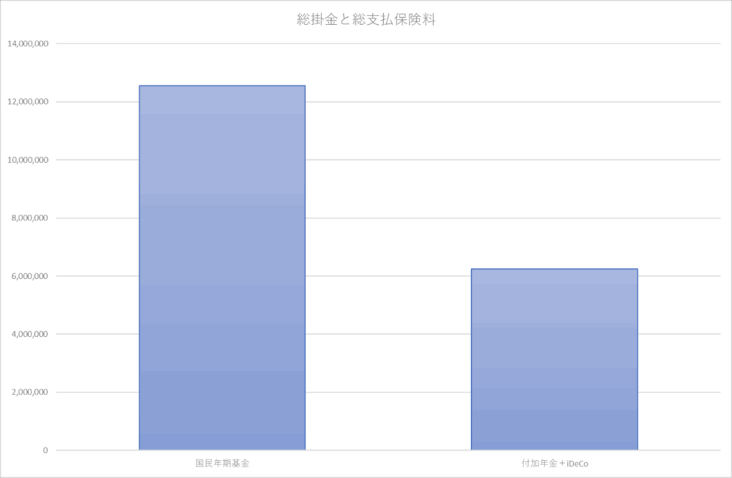 iDeCoは年利5%の投資信託での運用ですが、いずれも付加年金+iDeCoの方が低コストで年金作りができることが分かります。