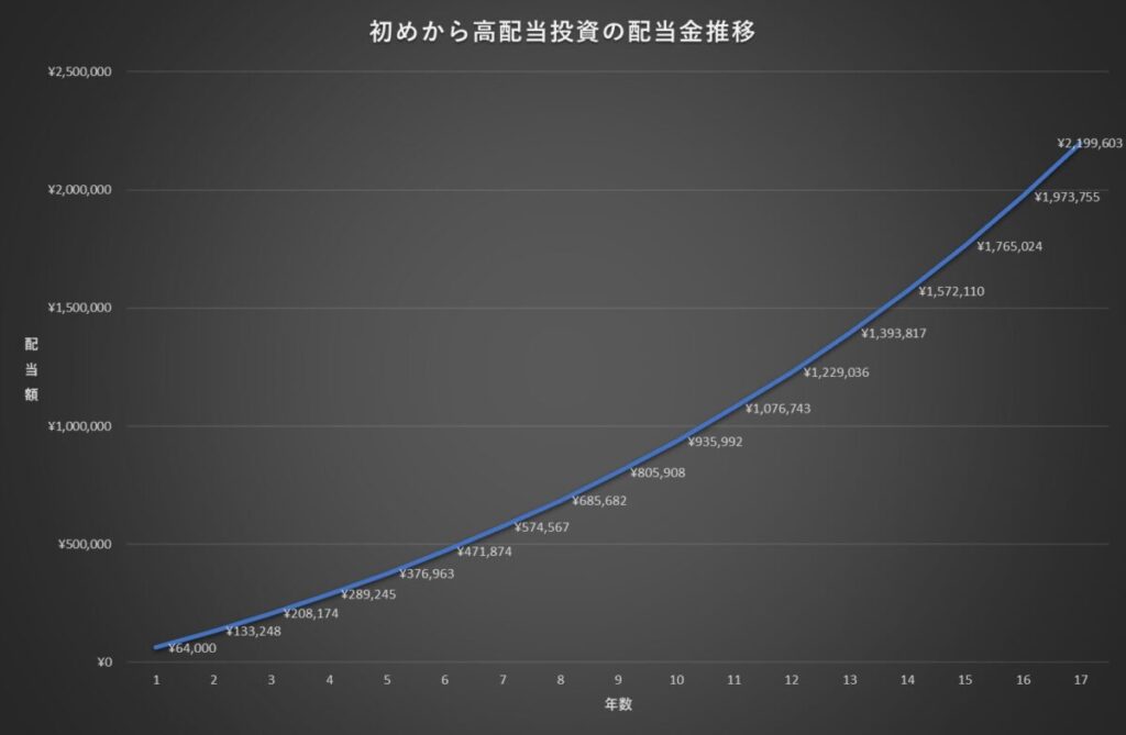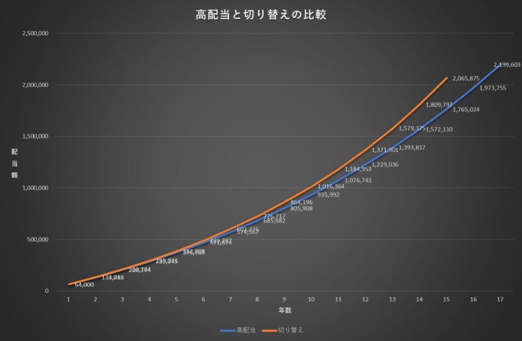 インデックス投資で増やしてから高配当投資に切り替えた方が2年も早いからこっちが正解だね!