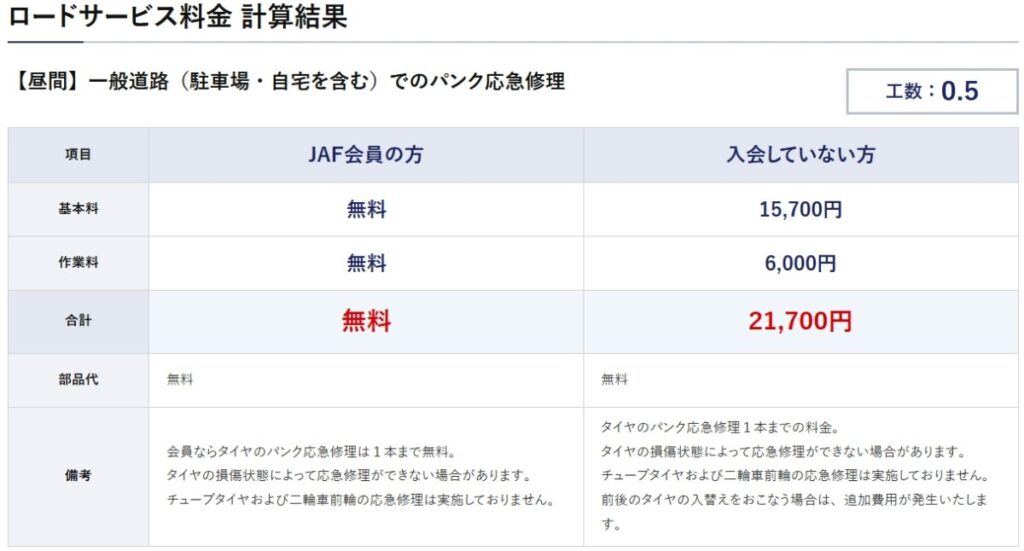 ちなみに、ソニー損保1年生の人がパンクしJAFを呼んでパンク応急修理の対応をお願いすると下記の料金が発生します。