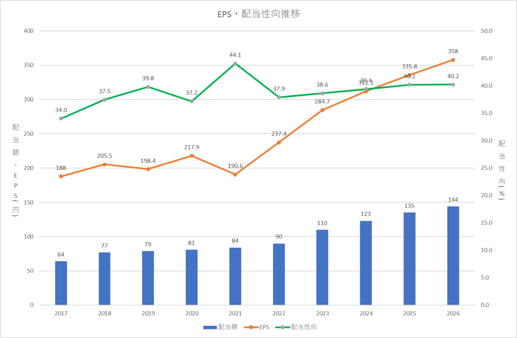 また、EPSと配当額も右肩上がりなので利益に応じた適切な配当を行っていることが分かります。