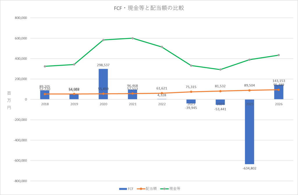 投資期間中はFCFから配当が賄えていないので現金等から捻出していることが現金の減少からも分かりますね。