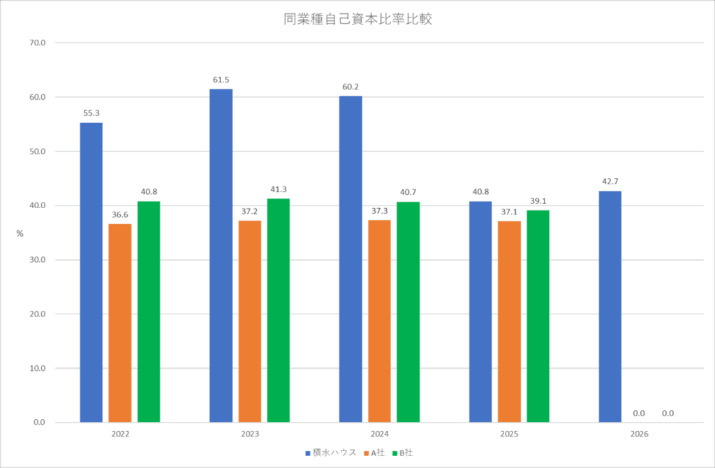 2025年~2026年は買収や投資期の影響で負債が増えているので自己資本比率は大きく低下しているものの、それでも同業種の水準内と言えます。