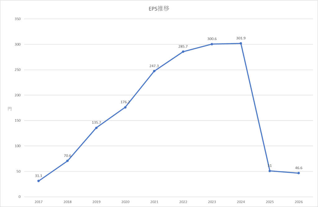 利回り4%以上、10期連続増配予定で株主優待もあり魅力的ですが、EPSの低下と配当性向の高さが気になります。